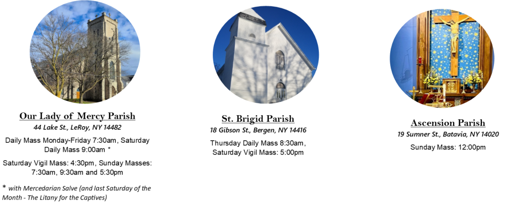 Our Lady of Mercy Parish: Saturday: 3:00-4:00pm , Tuesday: 7:00-7:30pm, Thursday: 6:00-6:30pm